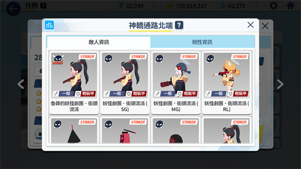 敌人资讯中可以看到有哪些敌方单位,以及敌方单位的攻击类型和装甲类型,例如这关的BOSS攻击类型是一般,装甲类型是轻装甲(红甲)。
