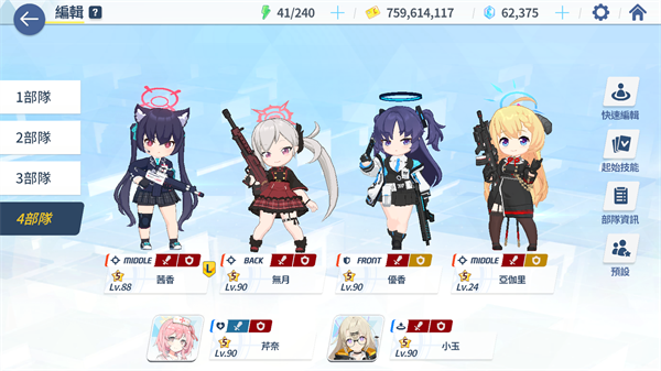 坦位:主要看生存能力,推图环境敌方命中普遍较低,闪避高的坦位生存能力在推图场合更有优势。第10章可刷取的T4包包对带包坦位的生存提升很大,防御坦很多需要T4包才能有足够的生存。注意坦位通常只放在中间两个位置,因为放角落可能另一侧的单位会被敌方锁定。