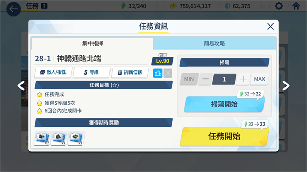 攻略模式分为“集中指挥”和“简易攻略”两种,任意一种模式通关即可解锁下一关,任意一种模式三星即可解锁扫荡(快速获取奖励)。
