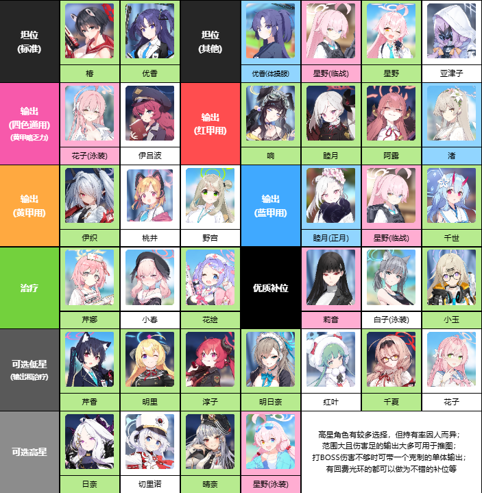 并不是不在表内就不能使用,但实际可用的学生过多,这里主要列举新手或初始号比较容易接触到的角色。