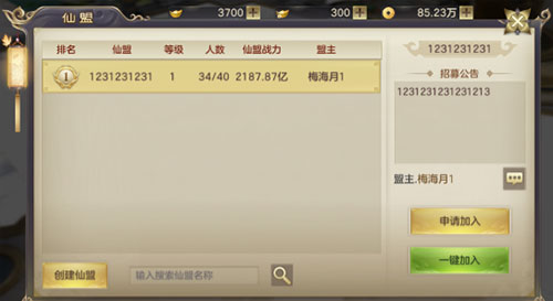 申请入盟:在仙盟界面的仙盟列表中,选择想要加入的仙盟,然后点击右下方的申请加入按钮,即可发出申请,也可以点击一键加入,同时向所有显示出的仙盟发出入盟申请。