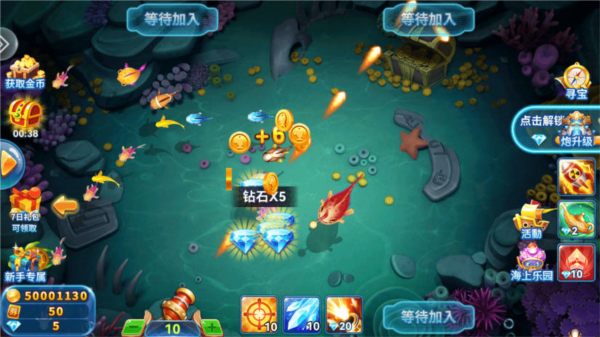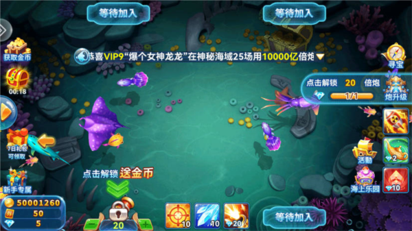 采用虚幻引擎4级渲染技术,构建荧光珊瑚、火山熔岩等动态海底世界。高精度粒子特效呈现鱼群穿梭、子弹爆炸的视觉盛宴,配合ASMR级环境音效(水流声/鱼群游动),打造身临其境的捕鱼体验。