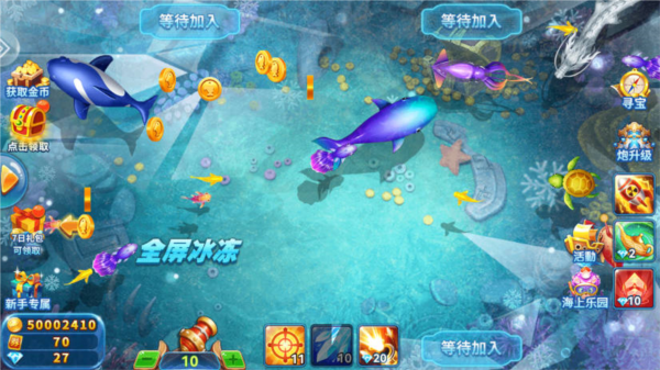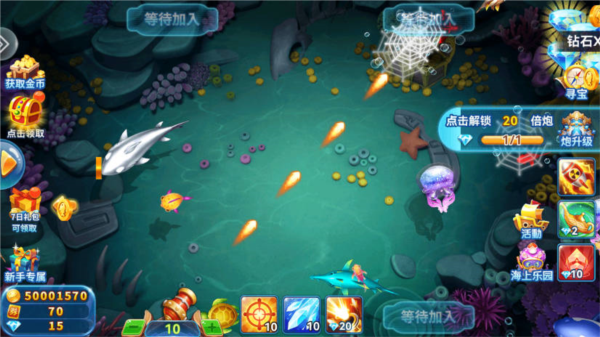 1、游戏中,玩家只需轻轻触摸屏幕,即可发射炮弹捕获海中的鱼类,操作简单直接。