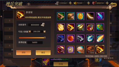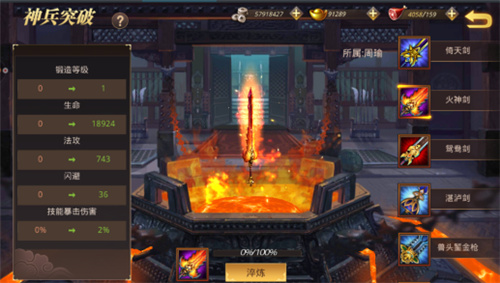 点击淬炼可以为神兵打造添加各类材料,当进度达到100%便可以 将武器正式进阶为神兵啦。主公添加的材料等级越高 所提供的 神兵淬炼度越高哦。