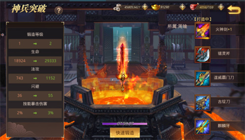 每次消耗图纸和突破石进行进阶时会有8小时的神兵打造时间, 打造结束后,神兵进阶成功。主公也可以通过花费元宝进行快速 锻造,直接完成锻造过程哦。