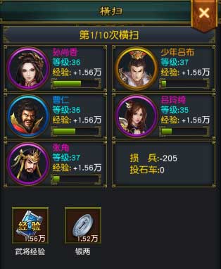 通过横扫挑战里面的战役可以非常有效率的获取银两,而过关斩将中每过五关得到的宝箱中更是可以开出大量银两,并且过关斩将也可以使用横扫,还不用损兵。如果这些方法用完后还是缺银两的话,我们可以在商店里利用元宝等货币来购买银两。商店: 过关斩将商店: 竞技场商店: 开启军功宝箱也可以获得大量银两。