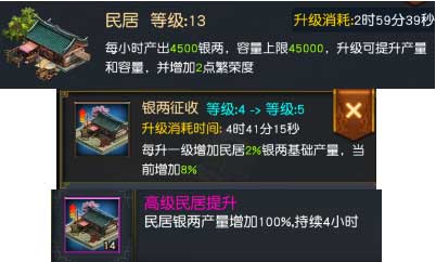 首先是升级建筑,通过升级官府来解锁更多的民居,通过升级民居来加快银两的产出速度,等民居等级高到一定程度后,哪怕什么都不做也可以收获大量银两。同时升级科技里的银两征收,以及使用道具民居提升可以进一步提升民居的效果。