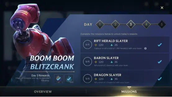 PS:任务分为5天,每完成1天的任务可以在任务界面左下角领取一次奖励,完成第五天的任务之后就可以领取皮肤宝箱了。
