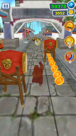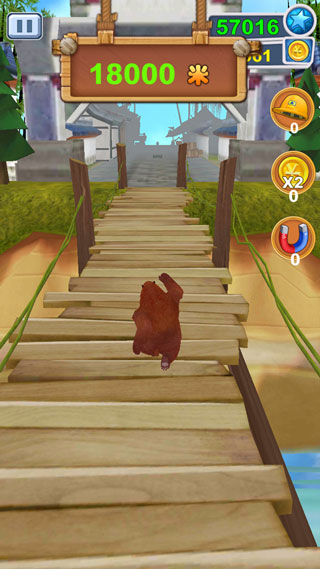 3、就像我们前面介绍说到的,你的目标是尽可能帮助熊大跑得更远,同时还尽可能的收集道路上的金币,游戏的视觉是面向角色前方前进的。