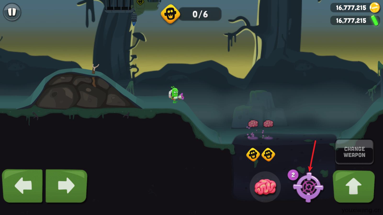 2、进入之后,通过左侧按钮移动,找寻这样的位置放置脑子,吸引僵尸出现。