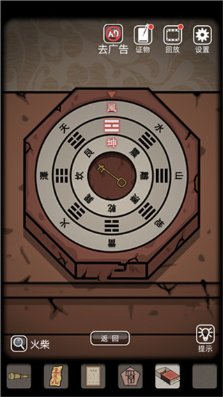 10、接着玩家点击柜子上的的香炉,插上三根香,随后使用火柴点燃,可以获得线索风、坤