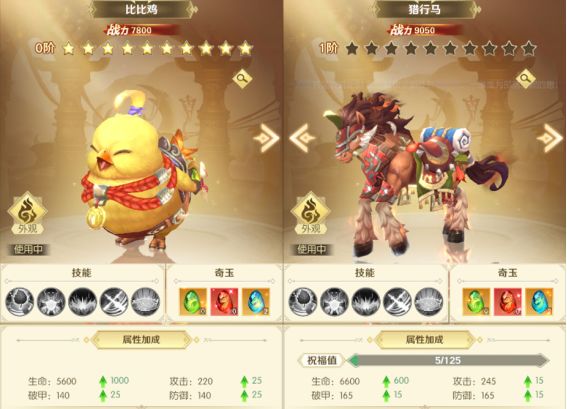 坐骑系统可以使用坐骑进阶玉与坐骑祝福玉提升坐骑祝福值,祝福值满后即可升星,坐骑达到十星后使用突破宝玉即可进入下一阶段。在外观上还可以切换为炫酷珍稀坐骑。