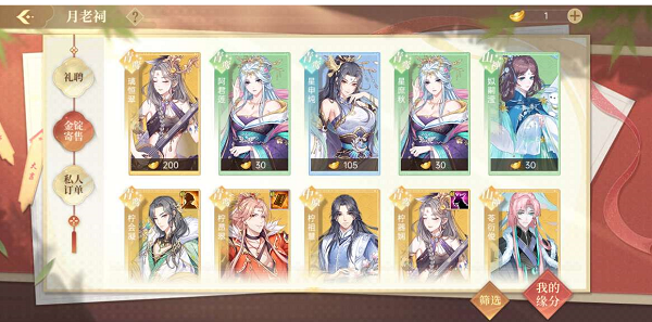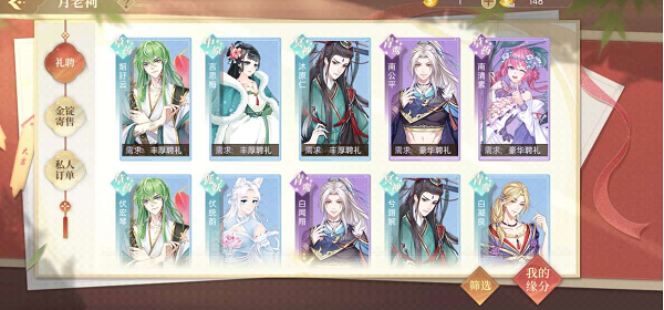 如果大家要在这里购买缘分的话,有两种类型的交易方式,一种是聘礼,一种是金锭(非绑定)。聘礼是可以通过绑定金锭购买获得的,金锭只能通过充值获得。一般在金锭寄售的都是比较好的缘分。