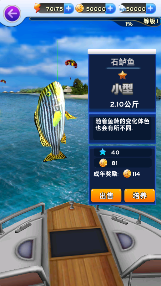5、成功钓上鱼后,可选择出售获取金币,或培养提升价值。
