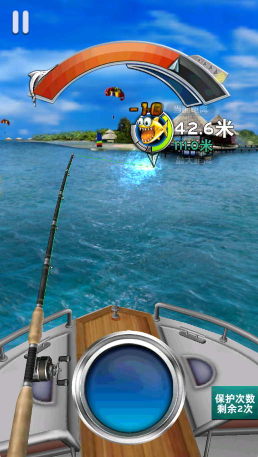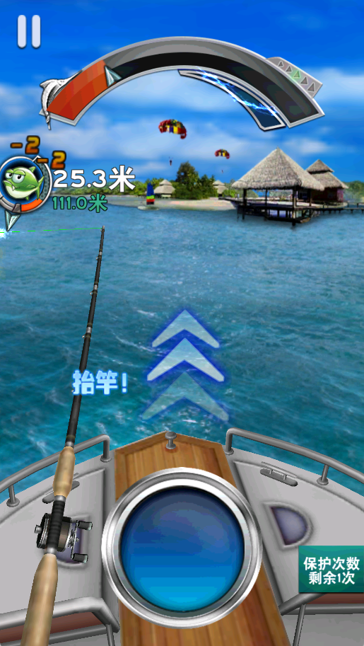 4、怒气值满后,迅速抬杆并疯狂点击按钮,即可快速将鱼拉近。若失败,重复上述操作。