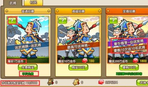 1、村长大人们可以在村庄界面下部点击【招募】→【武将】进入武将招募界面。每次招募都会额外赠送金币。