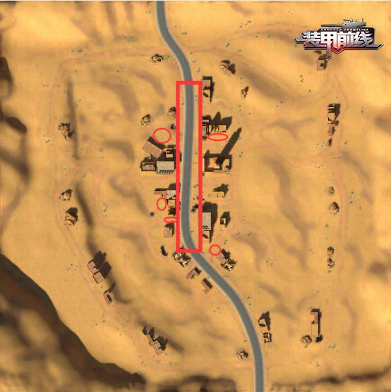 地图选用的是一张沙漠地图,比较符合现代战争的风格。地图两边是高坡,给步战车以及八轮突击炮提供不错的侦查以及黑枪的位置。用方块圈出的位置如果可以抢下来,那么不管是视野还是火力压制都有着明显的优势。圆圈都是一些黑枪的点位。