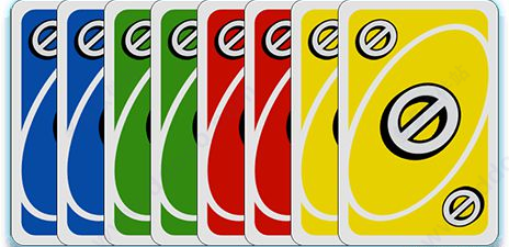 UNO牌由108张卡牌构成,包括76张数字 牌、24张功能牌和8张万能牌。UNO牌由四种颜色构成,包括红色、黄色、蓝色、绿色。