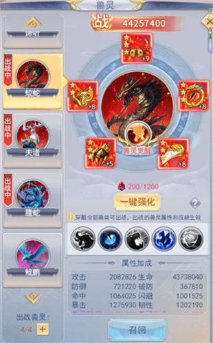 【兽装强化】:以最上方的装备为起点,按照顺时针强化,全部装备兽装升级到同一等级才会开始升下一轮升级