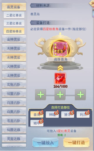 2、兽角需要击败神兽岛上的神兽获得,其余灵兽装备可以通过消耗兽源石打造而成