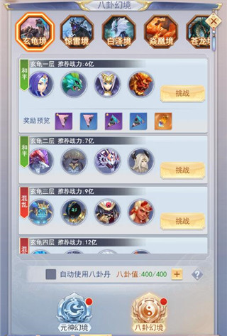 1、玩家可以前往八卦幻境获取八卦,八卦幻境分为5个境界,每个境界需要对应的八卦开启后才能同步开,而每个境界共分5层,1、2两层为和平层,3至5层为混乱层,会受到其他玩家攻击。