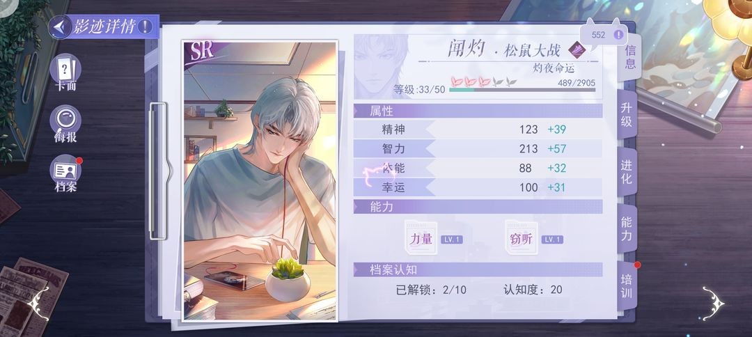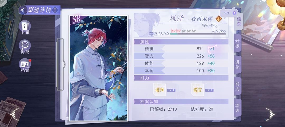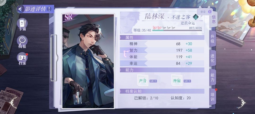 首先是惊心一悸,这张卡如果你没有识破和痕迹的ssr卡或者其他卡,这张你是必须要养的,因为主线里面会需要用到这两个词条,而且你要养到数值700以上,因为昆吾斩蛟剑2中有一条线索需要痕迹这一词条,但那条线索有两个词条还有一个词条是侦查,这个侦查不是硬性要求。当然如果你有侦查痕迹双词条的卡,直接养,因为侦查这一词条在主线中也是出现过硬性要求的。