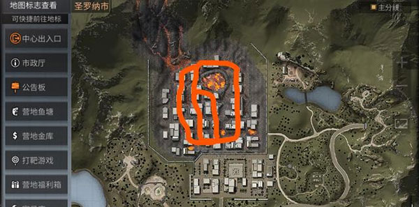 1、这个地图最难找的箱子,随机刷新的范围比较广,很需要耐心。刷新在地图中间的被岩浆侵蚀的城市区中的屋顶上,具体是哪些房子的房顶,小编已经为小伙伴们标出来了,详见下图。