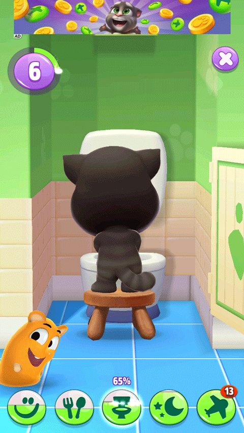 6、如果吃多了,汤姆猫会想上厕所,这时候就需要到浴室点击马桶,汤姆猫就会自己去上厕所了。