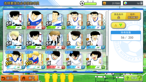 1、点击必杀技强化可以查看当前所拥有的所有球员卡牌,为了防止各位队长选择时出现错误,已经上场的球员会在左上角显示使用中字样,球员较多的队长可以通过界面右上角的筛选功能进行条件设置,更快的找到需要强化的卡牌。