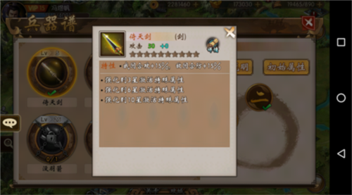 点击解锁的兵器即可以看到有关兵器的说明和其初始属性,目前战棋三国一开始自动解锁的兵器只有“倚天剑”(根据游戏开始选择的武将不同自动解锁的神器也不同,曹操-倚天剑,刘备-雌雄双股剑,孙坚-古锭刀),我们这里就拿最简单的“倚天剑”来举例吧!