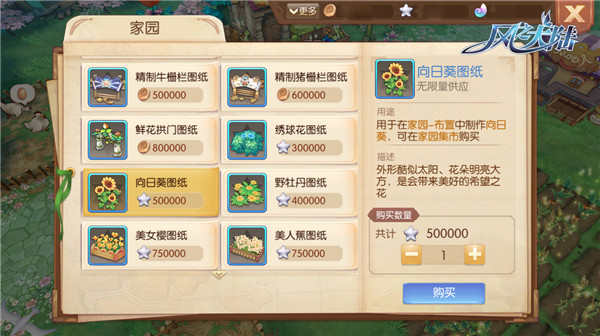 5、家园所有装饰及鲜花等图纸,均可通过家园杂货店购买。还不知道适合种植什么的小伙伴,可以先点击该花草或装扮,在摆放预览中看一下效果。如果哪一天觉得不喜欢这样的摆放,还可以在“布置”状态下,点击该装饰重新摆放位置哦~装饰栅栏,让农场更精致!