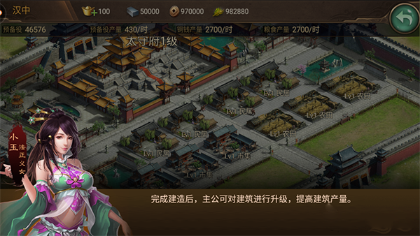同时我们也需要升级自己的太守府,因为太守府的等级是提高其他建筑等级的标杆。太守府的升级是需要金币的,而且需要一定的时间,等级越高需要的时间越多,可以使用加速道具来减少升级时间。