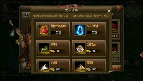㈤、统一得宝箱,宝箱分几个档次,紫,黄,白,紫玉宝箱能里面有武魂,有银两,有招募令更有几率获得橙将卡和橙装备,那么紫玉宝箱怎么获取呢!