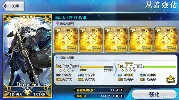 同时由于星级越高的从者强化时所消耗的QP越高,所以一些较低星级的狗粮不适合用于高星级从者的强化,否则前期有限的QP会显得十分吃紧,建议在50级以上的五星英灵不使用四星以下的狗粮进行强化。