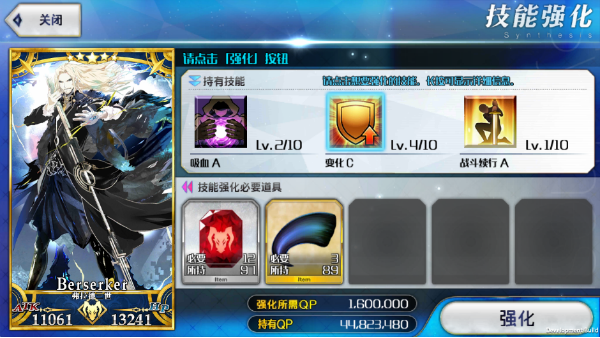 需要注意,如果要对从者的技能进行强化,必须满足该从者已经解锁了对应技能的前提,技能的解锁条件可以在卡牌图鉴中进行查看,在满足了已经解锁的条件后玩家便可以消耗对应的道具和QP对从者的技能进行强化。