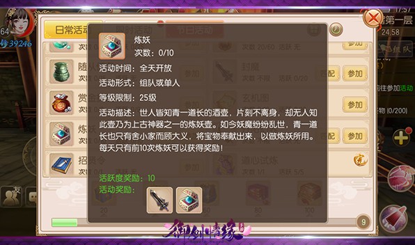 前往指定地点击妖怪进行击杀,每天只有前10次炼妖可以获得奖励。