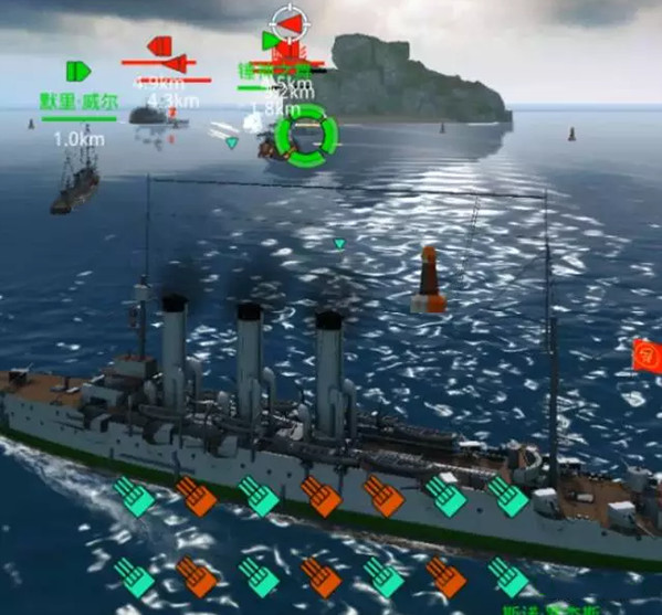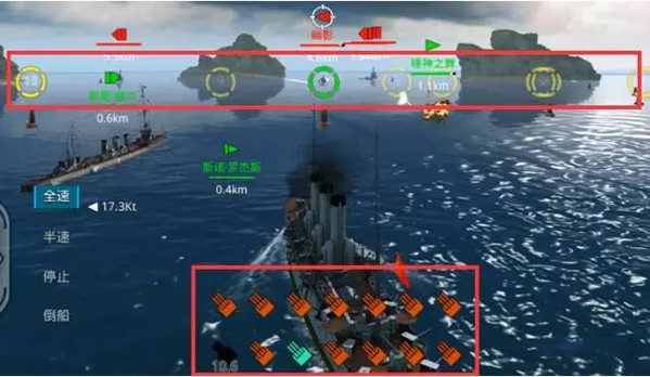 5、那么问题来了,怎么样才能更有效的提高输出呢?其实呢海战中有一种姿势叫做T头,也就是我方战舰用侧舷对着敌方战舰的船头,这样我们就可以同时使船首炮塔与船尾炮塔同时射击。由下图可以看出,转到侧身之后,可以开跑的炮塔明显增多。此时点击屏幕右下方开炮按钮,嘿嘿,就可以炮轰敌人啦。
