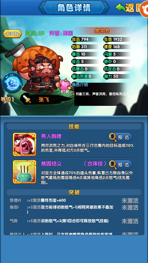 张飞:控制系血牛,怒喝一声降低对方怒气。