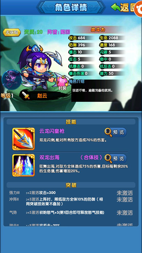 赵云是前期必得侠客,无需酒馆招募累计登录即可获得,赵云属于暴力输出型侠客,伤害很高,技能可以攻击全部敌方目标,而且赵云速度属性很高,缘分、进阶属性提升也都是对输出能力的提升,属于高成长的暴力输出武将,培养起来稳赚不赔。