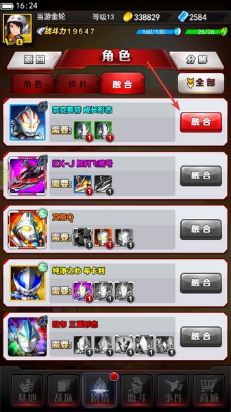 3、在融合界面收集其需要的素材后点击【融合】按钮即可融合角色