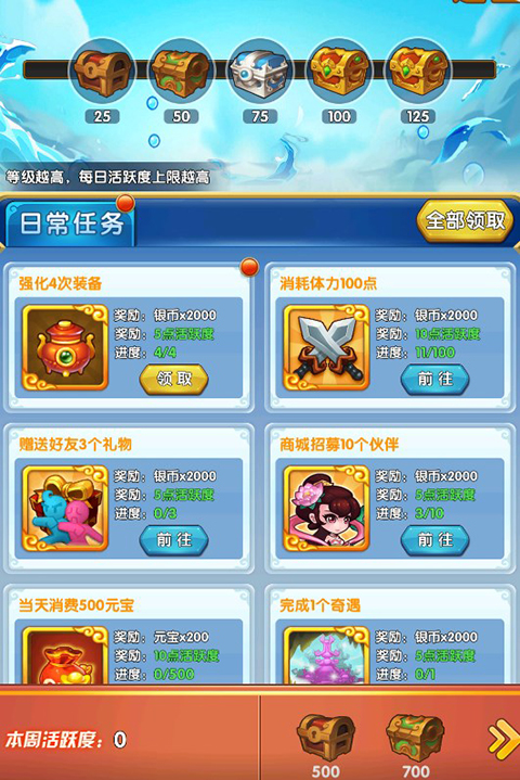 每日任务完成之后可以得到大量的银币奖励,不可错过呦。