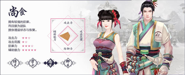 游戏中的尚食的定位为肉盾与辅助,可以通过各种增益和减益buff在战斗中发挥作用。