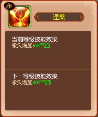 6、涅槃(辅助技能):可以增加很多气血,搭配主角的气血+12%的缘分可以提升很多的血量。