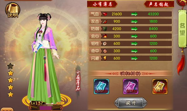 从尚食主角名望升级所加成的各属性数值来看,尚食的主要培养方向是气血和防御,也可以带点攻击和韧性