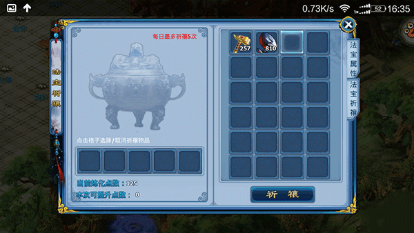 冰冻三尺非一日之寒,法宝也和天命系统一样,需要升级,才可以实现实力的飙升,这就需要每日祷告,每日祷告五次,获得提升点,现阶段除了系统开始送的石头可以吃掉获得1W提升值以外,就靠消耗玄铁和锤子,来获得点数。别再发愁锤子和玄铁占包裹,这都是升级必备材料。