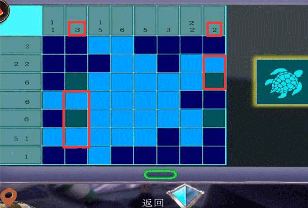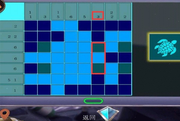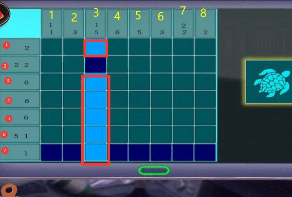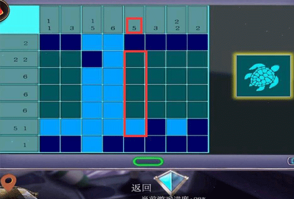 12、第二列数字为3,也就是连续亮起三块瓷砖,第四、六块瓷砖是固定亮起了的,只能选择点击第五块瓷砖。而第八列数字为2,连续两块瓷砖亮起,点击第八列第三块瓷砖即可。