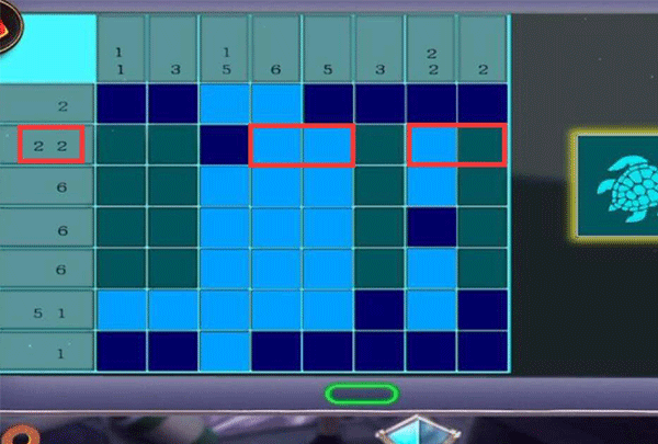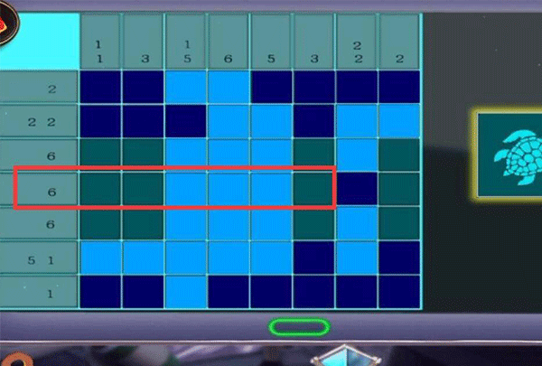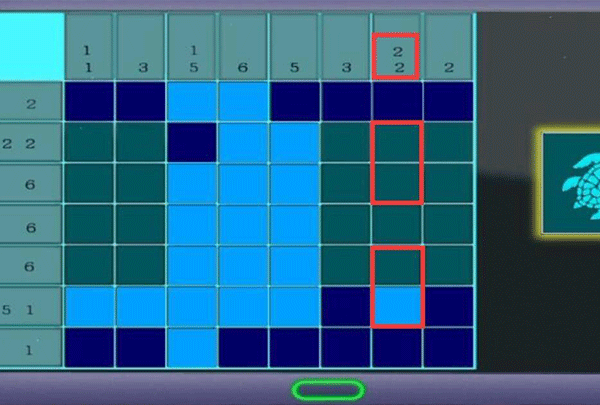 8、根据第七列数字22,而第一块不亮,第六块亮起,可以得到第七列的瓷砖是两个亮起隔一块再亮起来两个,也就是点击第二、三、五、六块瓷砖。