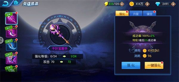 1、强化装备等级。消耗金币可提高装备等级,是最直接的提升装备属性的方式,为了方便镇魂师们强化装备,我们还提供“一键强化”功能哦!
