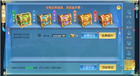 11.玩家可以花费元宝刷新宝箱品质,宝箱被协助后可获得绑元奖励,每人每天有3次免费提升宝箱的机会。