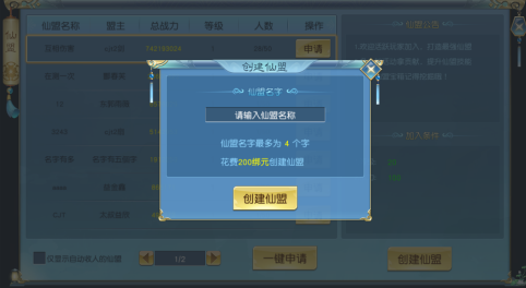 2.创建仙盟需要消耗200绑元,绑元不足时,可用元宝代替,玩家输入仙盟名称且扣除指定绑元后即可创建仙盟。